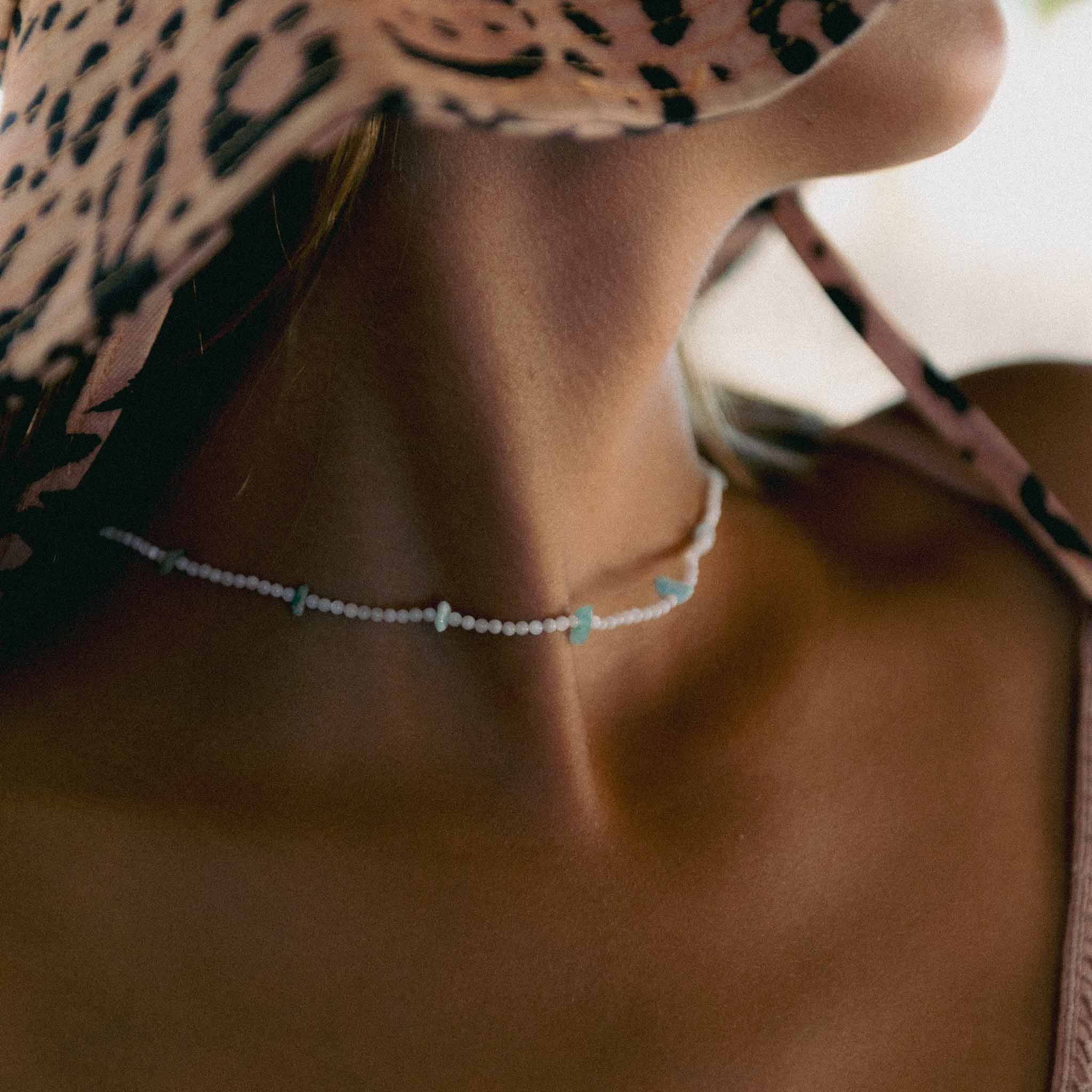 The Mount Ka‘ala Beaded Necklace is made with shimmering troca shell beads and natural blue-toned stone chips on a wax polyester cord. A beaded necklace with shell texture and natural stone detail.