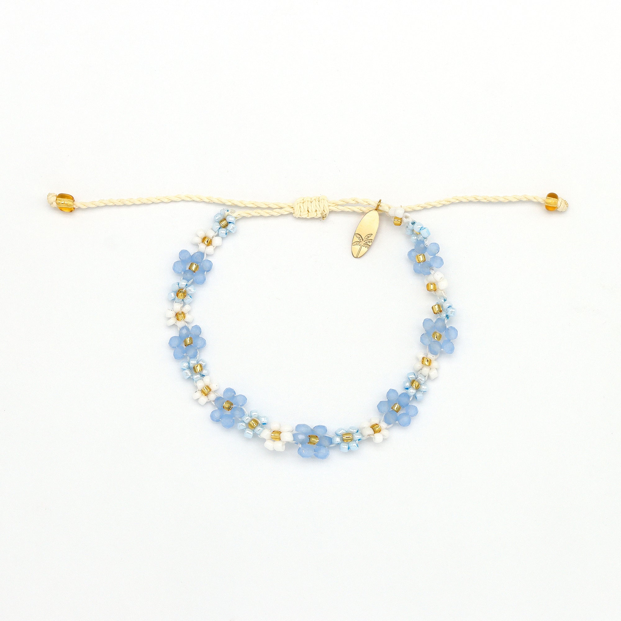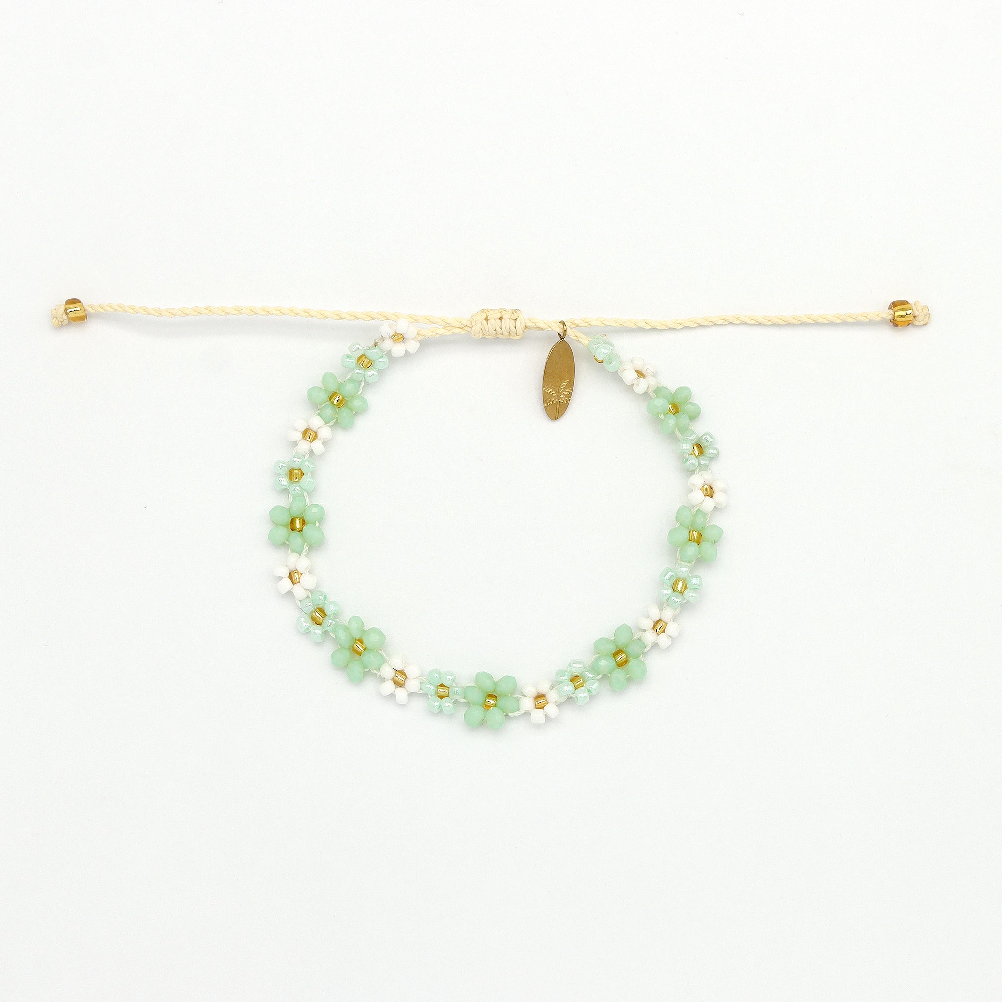 The Mohala Flower Beaded Bracelet is formed from tiny seed beads linked into a continuous chain of flowers, with subtle size variations that soften the pattern.