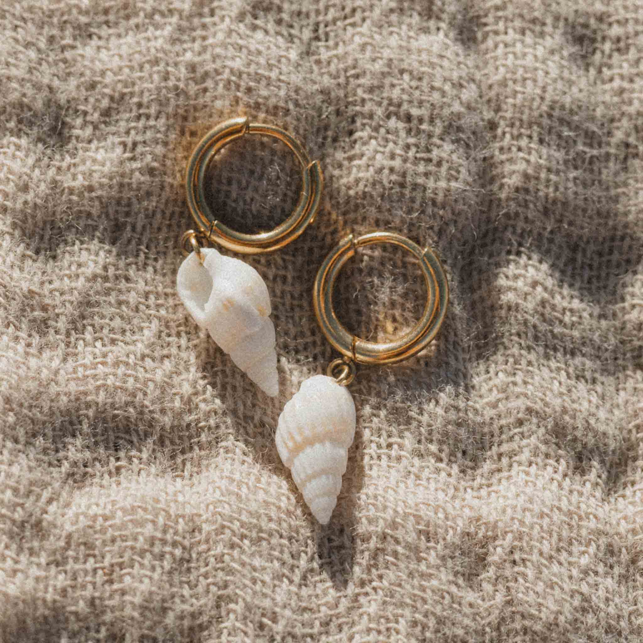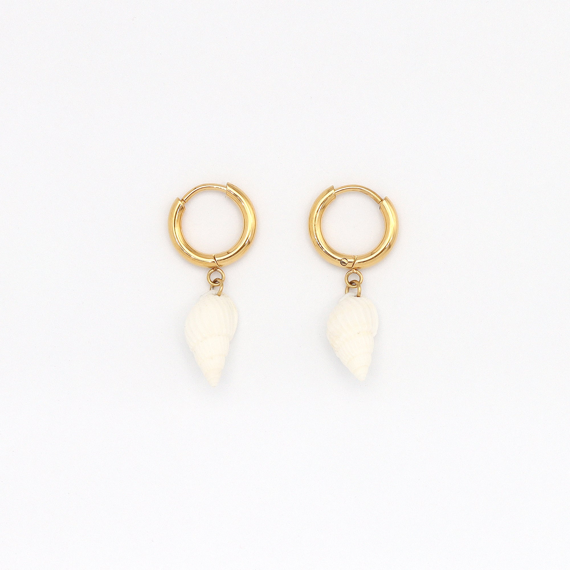- Made with 14K gold PVD-coated stainless steel click-clasp closure hoops and real seashells.
