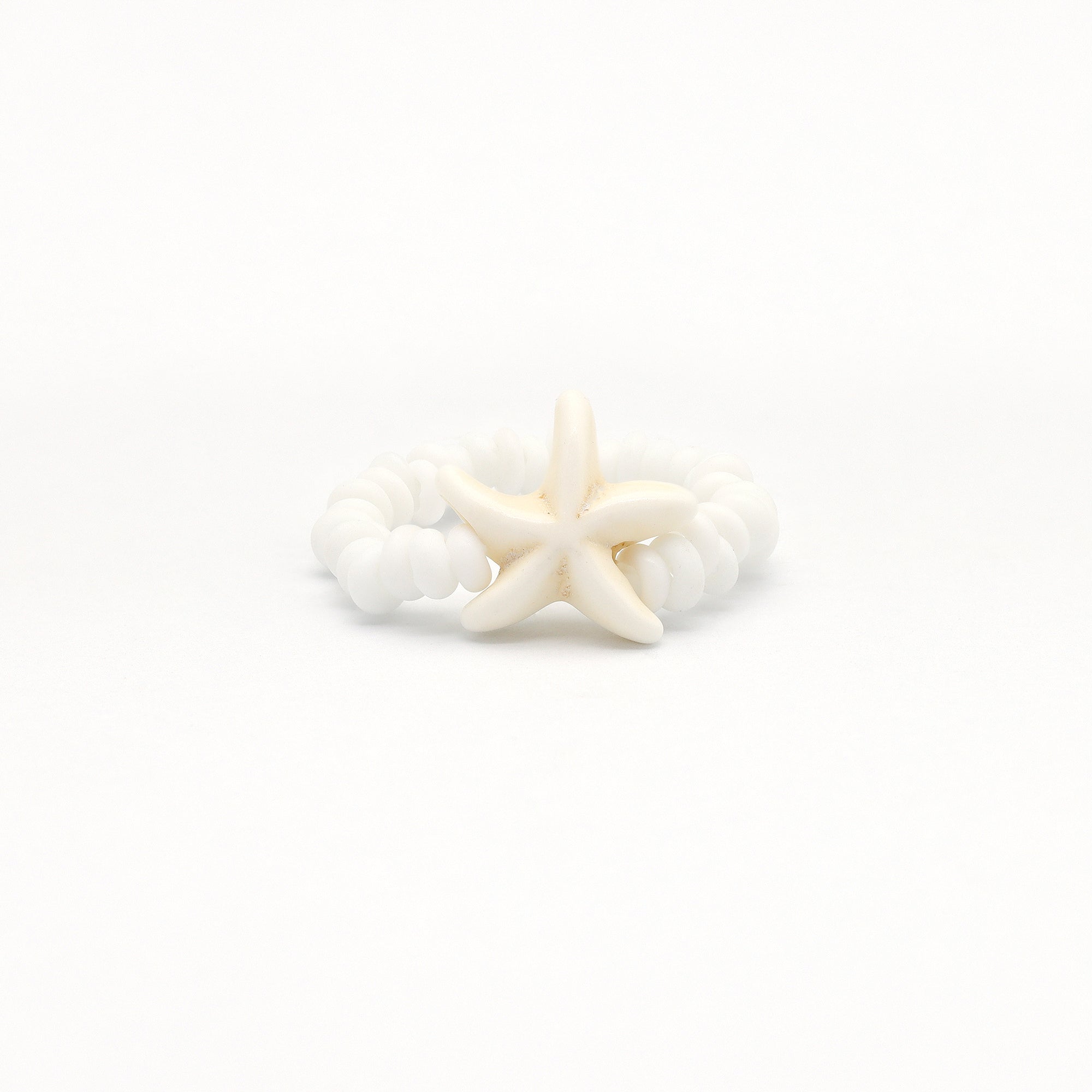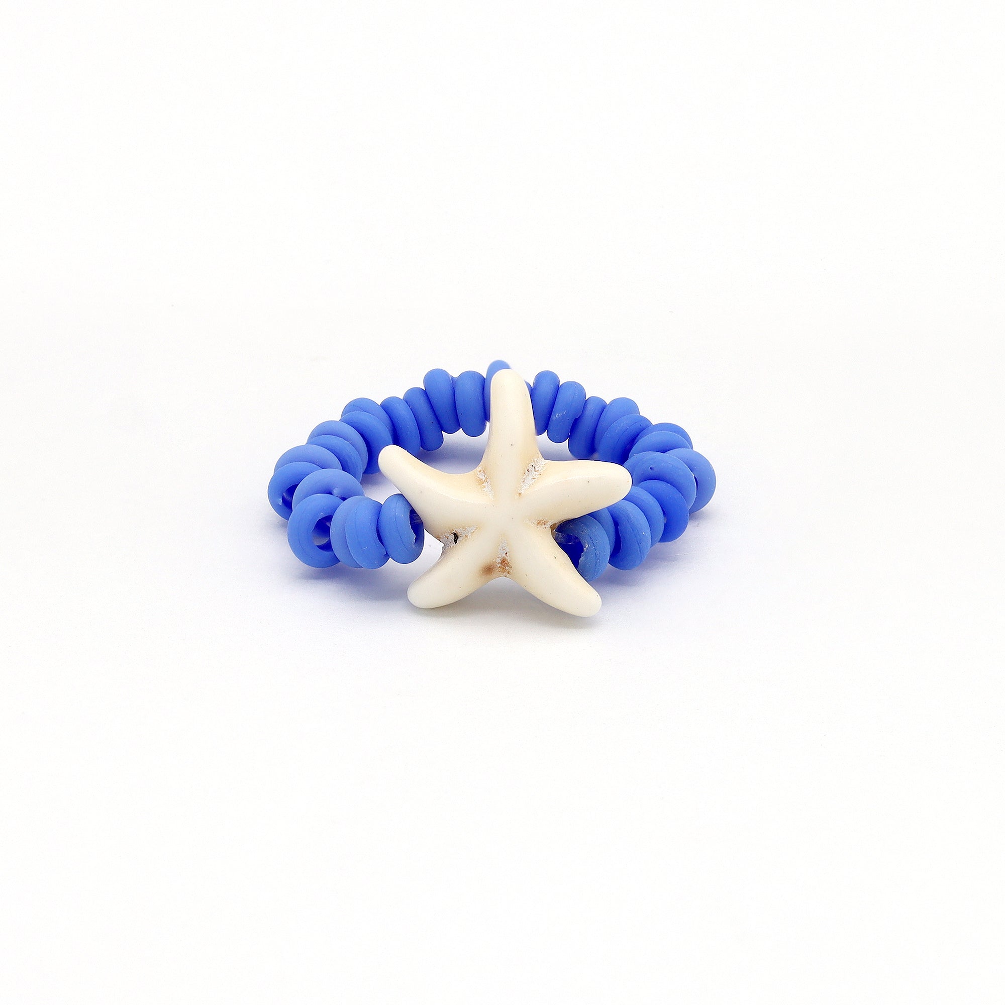 The Tidepool Starfish Ring Set includes two elasticated rings made with white and blue glass beads and a small ceramic starfish charm. A simple beaded ring set with subtle ocean-inspired detail.