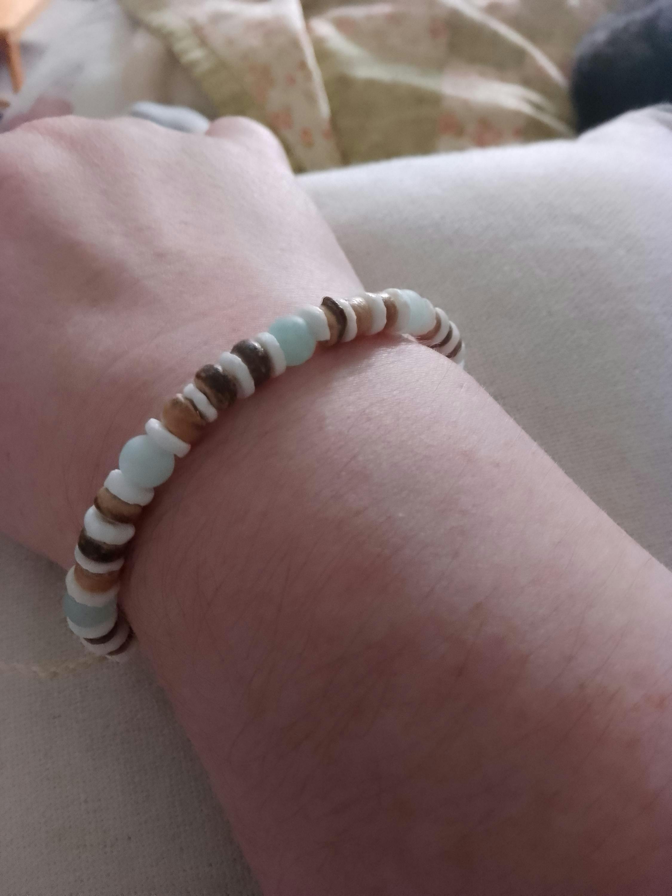 - Made with natural stone, wood, real puka shell beads and a wax polyester cord.