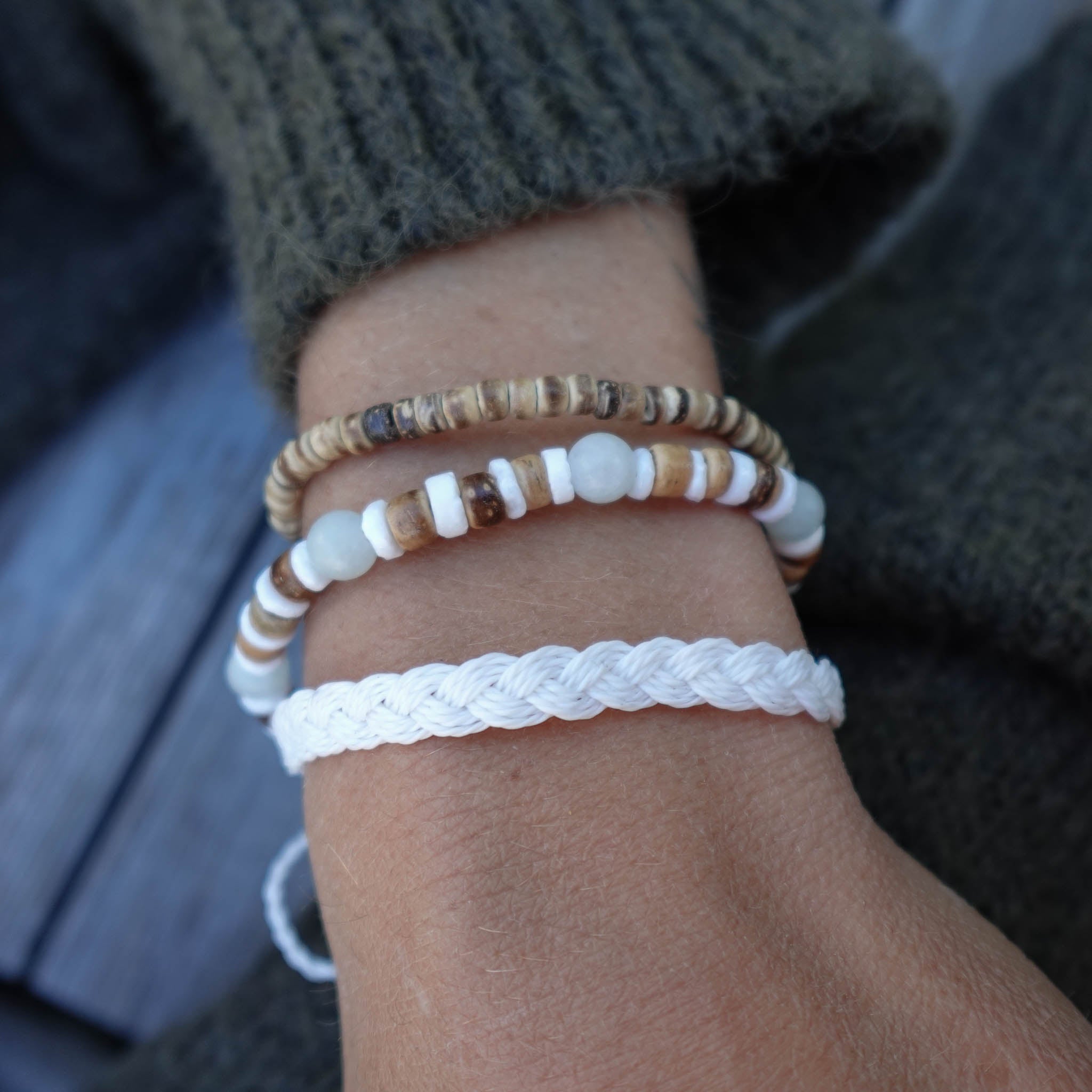 - Made with natural coconut wood beads, white puka shell, wax polyester cord, and natural stones, all finished with our signature stainless steel charm.