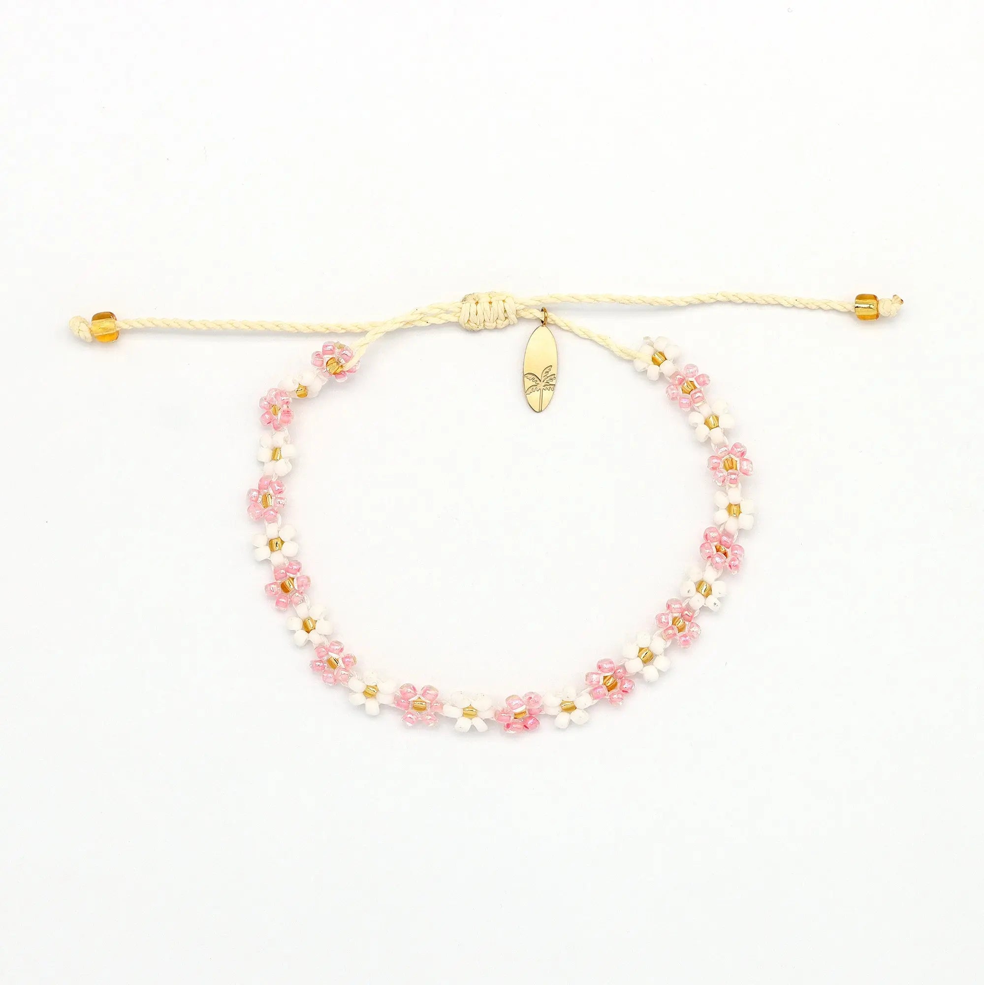 Kelopak means “petal” in Indonesian. The design is a nostalgic daisy-chain style with bright colour contrast, with gold accents and our palm tree surfboard charm completing the piece.