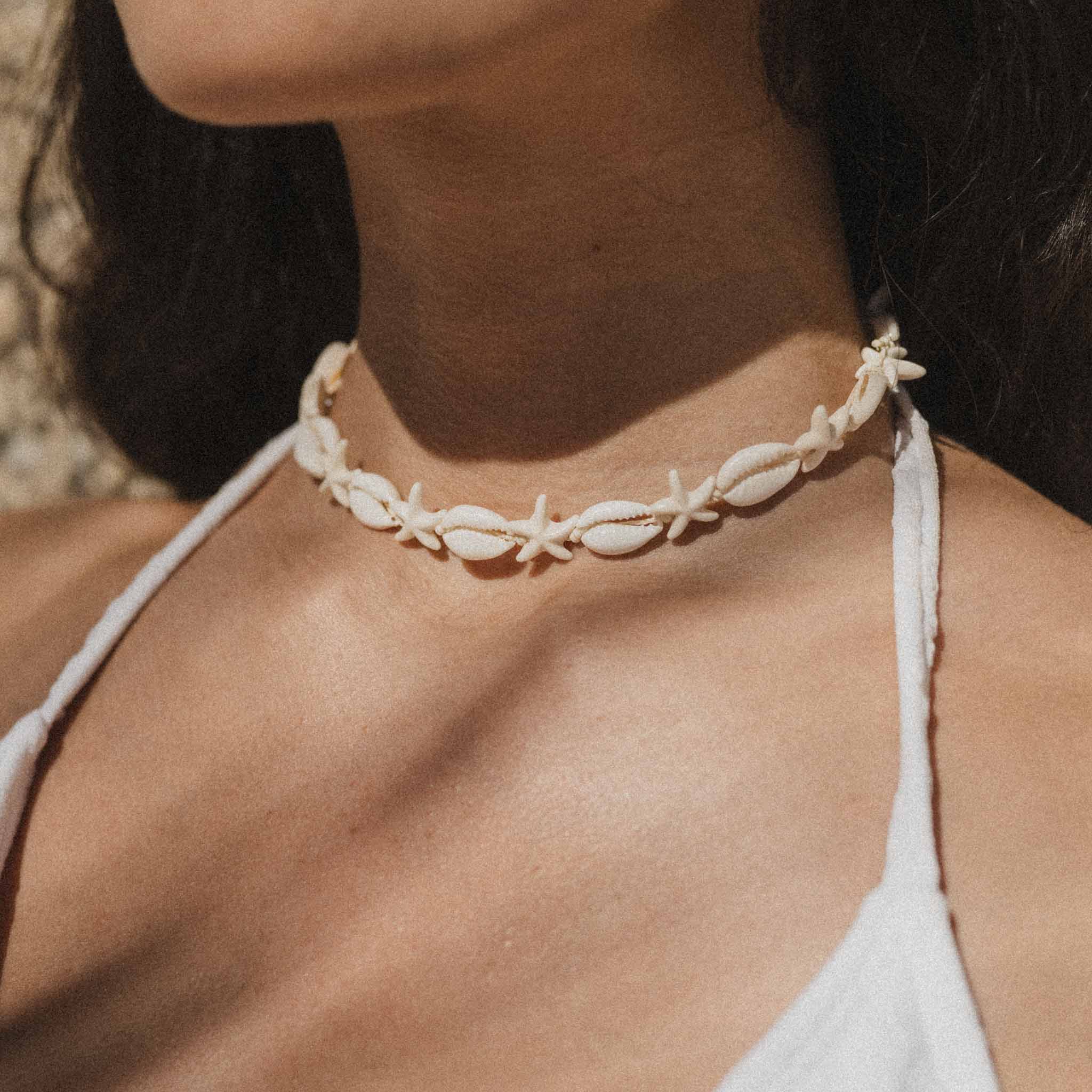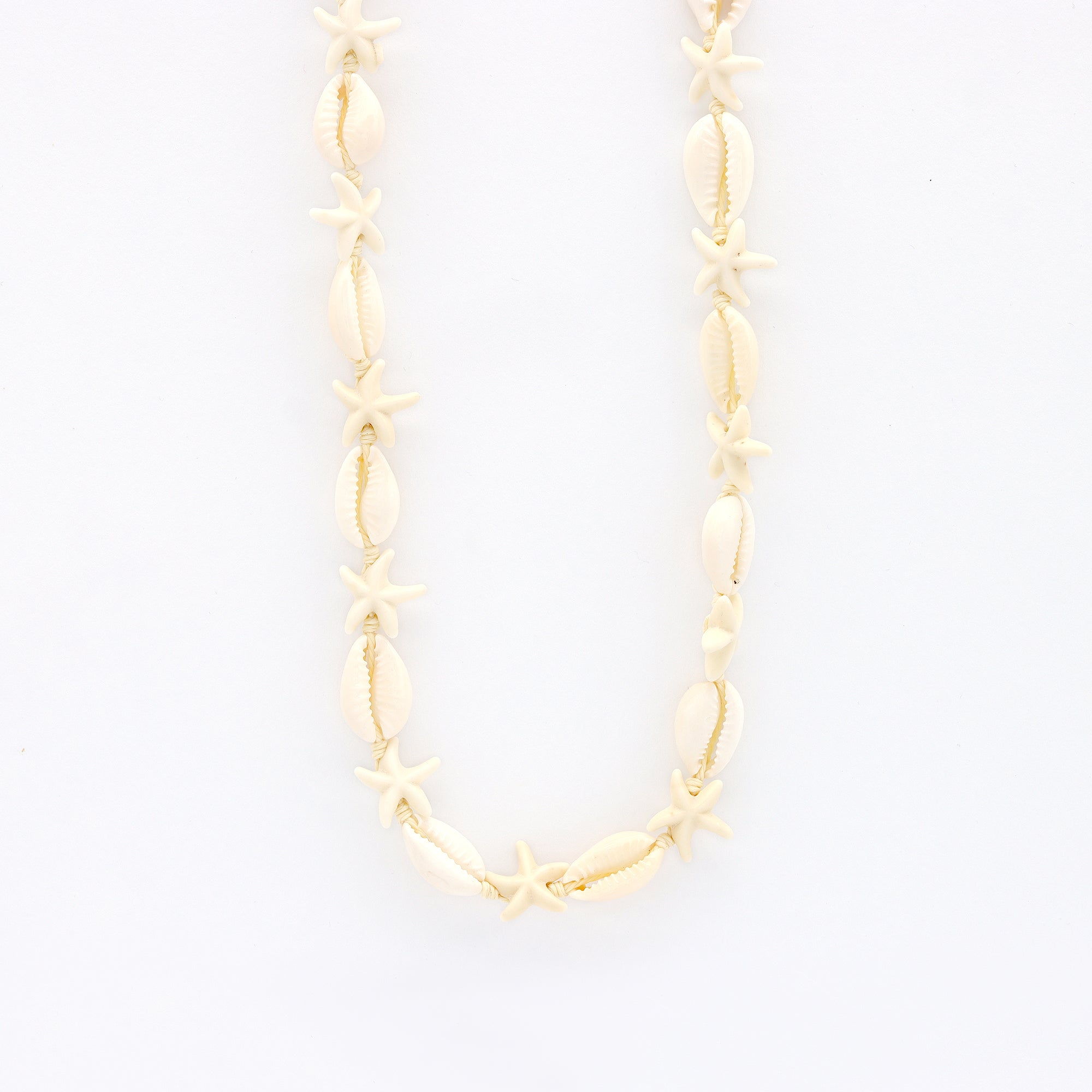 The Kahakai Cowrie & Starfish Necklace combines natural cowrie shells with a ceramic starfish bead detail, threaded onto durable wax polyester cord.