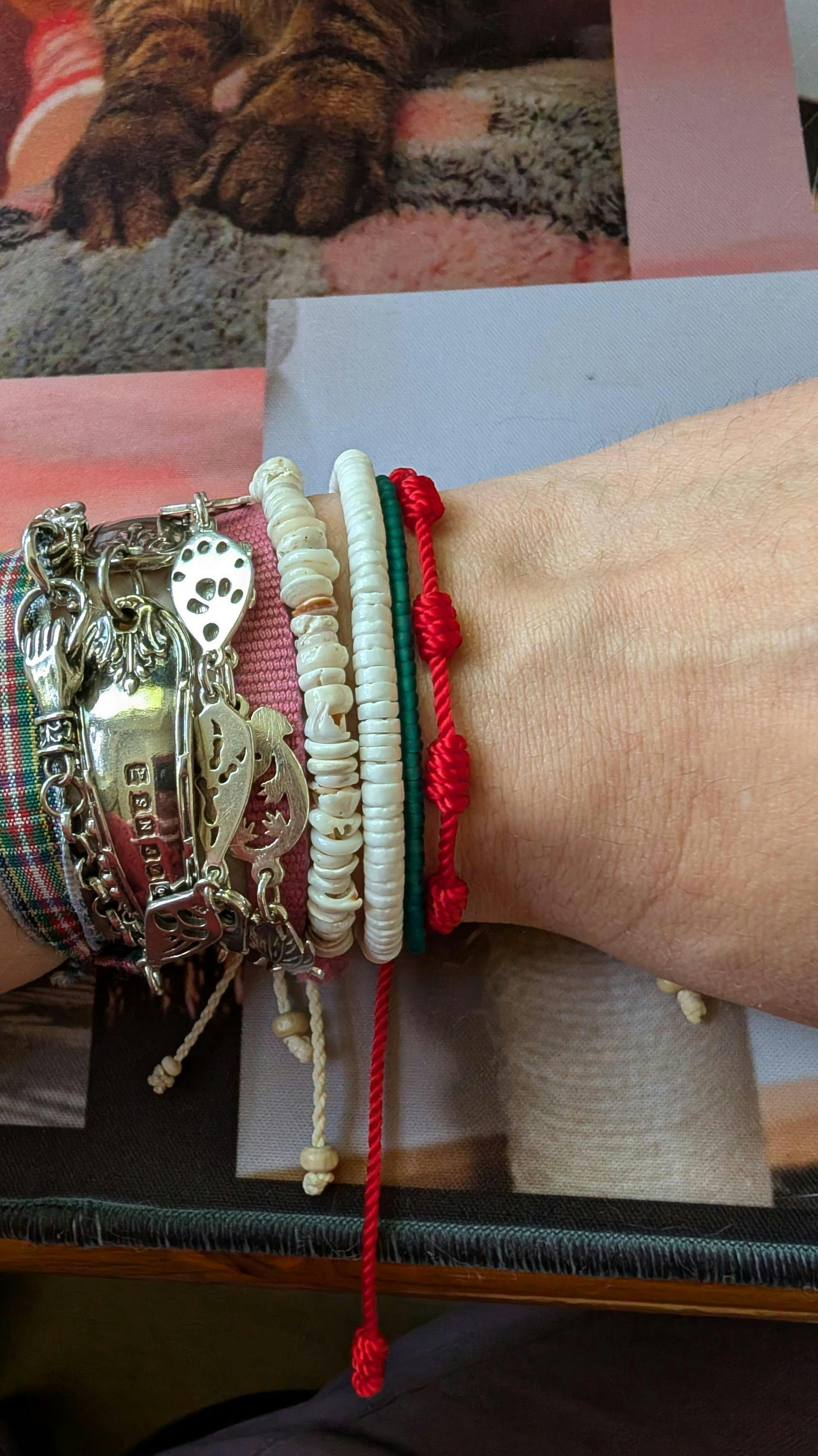 • Made with a wax polyester cord, natural shell beads and silver-plated zinc alloy.