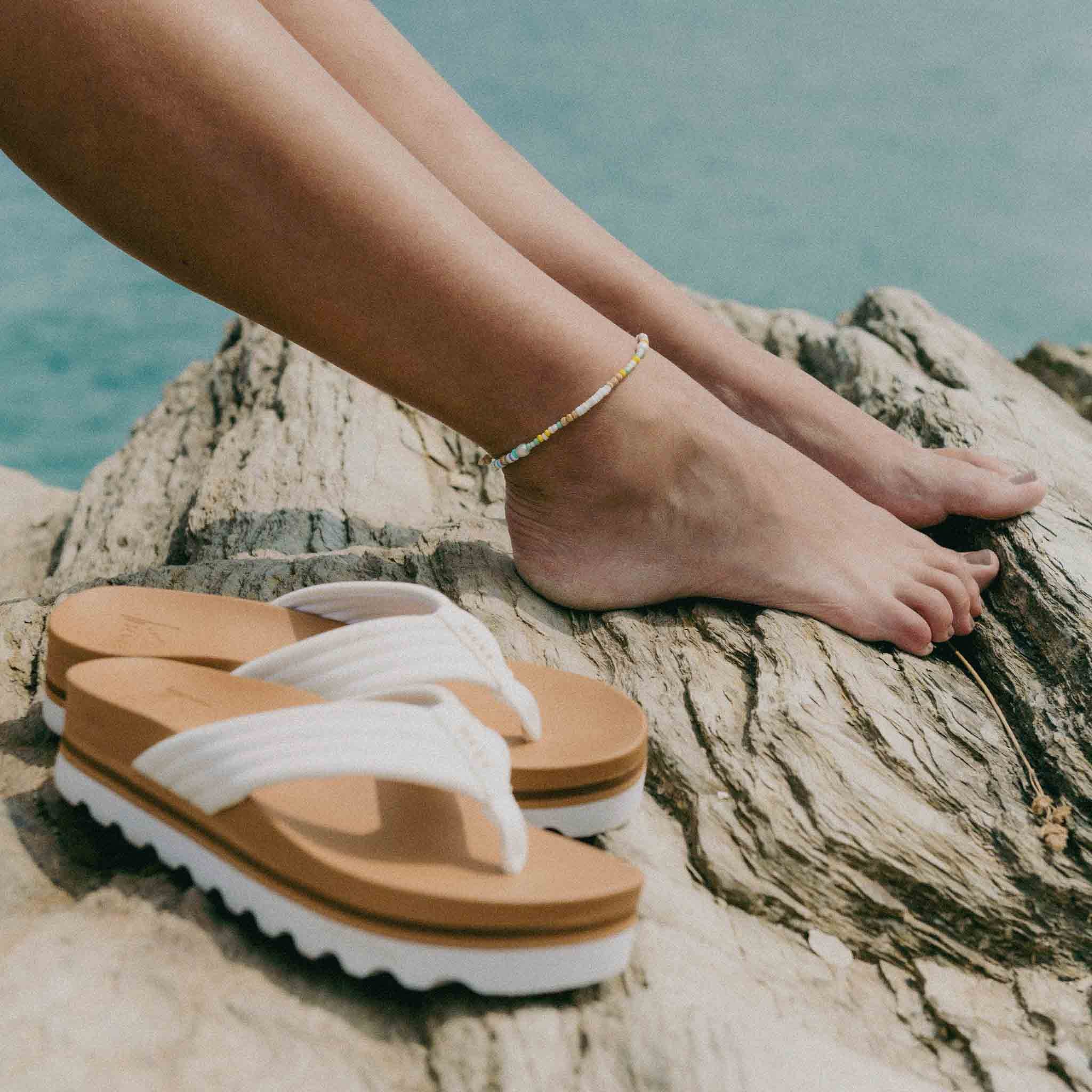 Named after the islands off the west coast of Sumatra. Puka shell, freshwater pearls, wood and polymer clay beads, with little bursts of colour scattered through. Eclectic beach jewellery, handmade in Java by our long-term artisan partners. Wear it alone or stack it.