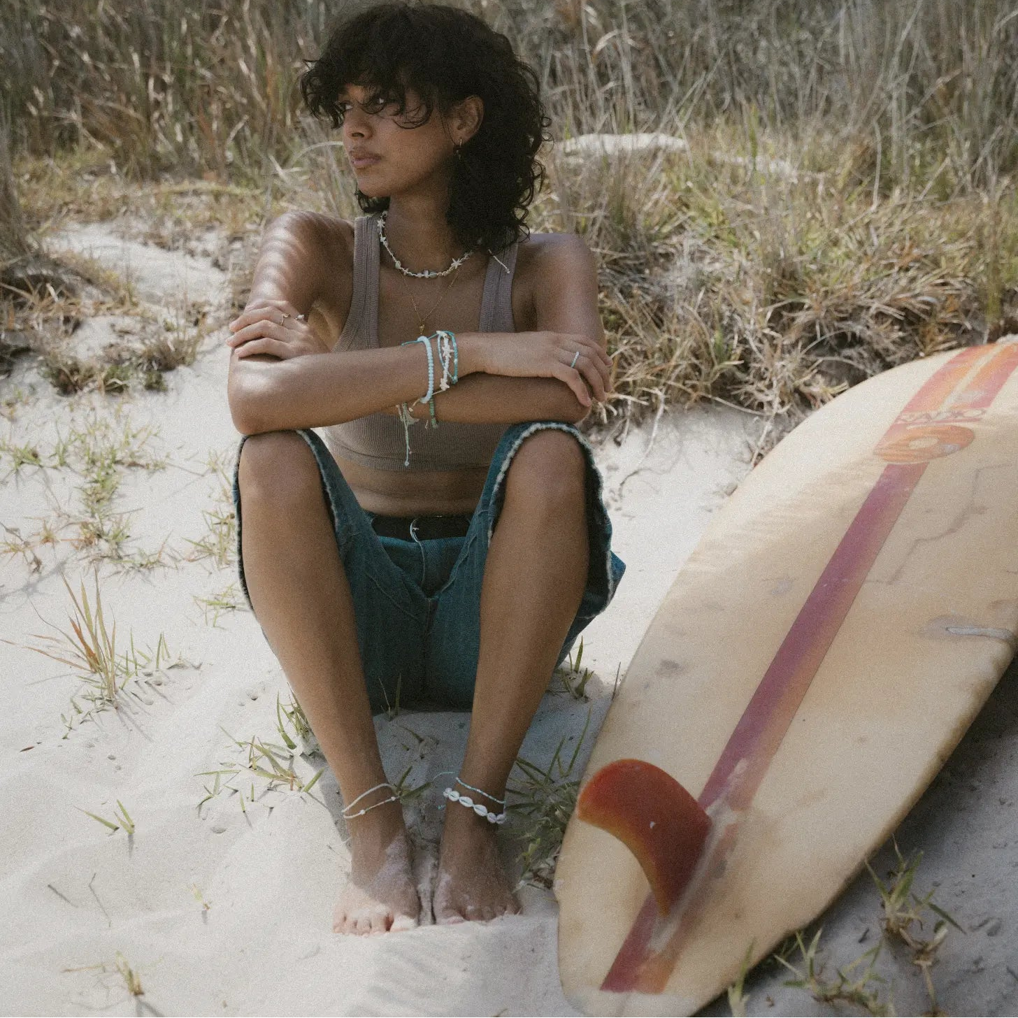 Turquoise and cowrie shells, the original beach pairing. Four anklets handmade in Java that sit close to the skin and go straight into the water.
